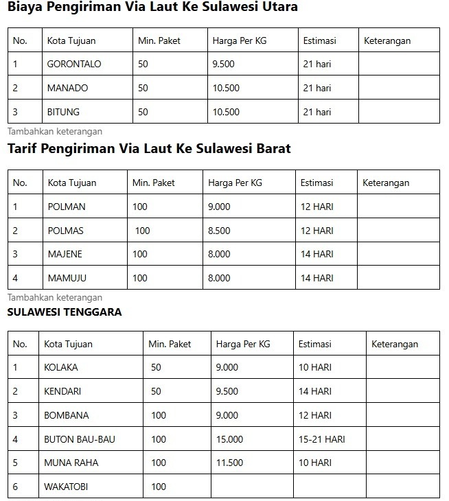 Selain biaya, waktu pengiriman juga menjadi pertimbangan penting. Untuk ekspedisi Jakarta ke Sulawesi tengah, Sulawesi selatan, atau daerah lain, estimasi waktu berkisar 10 hingga 21 hari. Semua tergantung jadwal kapal dan jarak tujuan.
